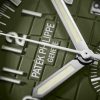 New Patek Philippe Aquanaut Chronograph luxury sports watch, 42,2mm, 18k White Gold, Ref. 5968G-010. The first chronograph with a flyback function in the modern Aquanaut sports collection, which perfectly matches the character of this young and dynamic watch line. His 18k White Gold rounded, pillow-like octagon-shaped case and gently curved ears are unmistakable. On a beautiful Khaki green dial with embossed embossing, perfectly readable large applied polished Arabic numerals made of 18k White Gold with luminescent coating in the form of hour markers look harmoniously. The manufacturer paid special attention to the second track on the outer rim of the dial. She is applied in long and short silvery lines with fairly wide luminous marks located every 5 minutes. Large polished luminous hour and minute hands in 18k White Gold indicate the time. These are complemented by a slim and elegant chronograph second hand (Sweep seconds hand). At the 6 o’clock position, there is a recessed green auxiliary chronograph counter with reverse movement repeating which follows the rounded octagonal shape of the bezel. It has glowing white Arabic numerals, white markers, and a white indicator needle. The date window is traditionally at the 3 o’clock position. Rectangular 18k White Gold buttons located on the right side of the case control the chronograph. At the 8 o’clock, position on the case is an instant date corrector. A polished 18k White Gold screw-down crown with a ribbed edge for a comfortable grip and the Patek Philippe logo is the finishing touch to the perfect picture. The dial is covered with a scratch-resistant sapphire crystal. The screw-down case back is also made of sapphire crystal, which allows you to see the magical work of the movement. Against this backdrop, a flat, fixed bezel in 18k White Gold, vertically ground on the front and polished on the sides, provides a wide view of the dial. The finish on the side of the bezel is amazing because at first glance, it looks rounded, but upon closer inspection, you can see the crisp edges playing with the light. The model is equipped with a Patek Philippe caliber CH 28‑520 C with a self-winding mechanical movement containing 32 jewels and a power reserve of min. 45 hours – max. 55 hours. This beautiful sport chic watch is presented on a Khaki green tropical rubber strap. This new composite material is highly resistant to wear, salt water and UV radiation. The strap are fastens with Patek Philippe’s patented 18k White Gold folding clasp, polished and engraved with the Calatrava cross. Opening the clasp reveals the engraved Patek Philippe logo with the word GENEVE. Water resistant up to 120m/394ft (12 ATM).