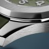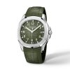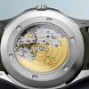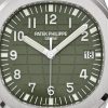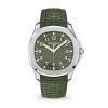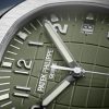 New Patek Philippe Aquanaut Jumbo Date Sweep Seconds luxury sports watch, 42.2 mm, 18k White Gold, Ref. 5168G-010. They are reliable and practical, modern and somewhat unexpected, inspired by Nautilus. Their 18k White Gold case features a rounded, cushion-shaped octagon that is unmistakable. It has polished crown guards protruding from the right side of the watchcase to protect her. The beautiful embossed Khaki green dial is one tone lighter than the strap, which has the same geosphere pattern. This color combination of dial and strap is the main attraction of this model. Perfectly readable large applied polished Arabic numerals made of 18k White Gold with luminescent coating in the form of hour markers look harmoniously. On the outer rim of the dial, a silver second track is printed with fairly wide luminous marks located every 5 minutes. The time is indicated by large polished 18k White Gold luminescent rod-shaped hour and minute hands, as well as a thin and elegant Sweep Seconds hand. The aperture date indicator is traditionally located at the 3 o’clock position. A polished 18k White Gold screw-down crown with a ribbed edge for a comfortable grip and the Patek Philippe logo is the finishing touch to the perfect picture. The dial is covered with a scratch-resistant sapphire crystal. The case back is also made of sapphire crystal, which allows you to see the magical work of the movement. Against this backdrop, a flat, fixed bezel in 18k White Gold, vertically ground on the front and polished on the sides, provides a wide view of the dial. The finish on the side of the bezel is amazing because at first glance, it looks rounded, but upon closer inspection, you can see the crisp edges playing with the light. The model is equipped with a Patek Philippe caliber 26‑330 S C with a self-winding mechanical movement containing 30 jewels and a power reserve of min. 35 hours – max. 45 hours. This beautiful sport chic watch is presented on a Khaki Green tropical rubber strap, made from a new composite material that is ultra-resistant to wear, salt water and UV radiation. It fastens with Patek Philippe’s patented 18k White Gold folding clasp, polished and engraved with the Calatrava cross. Opening the clasp reveals the engraved Patek Philippe logo with the word GENEVE. Water resistant up to 120 m/394ft (12 ATM).