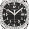 New Patek Philippe Aquanaut Luce luxury Ladies watch, with a larger diameter 38,8mm, Stainless Steel, Ref. 5267/200A-001. The first complex quartz wristwatch in the modern Aquanaut sports collection, which perfectly matches the character of this young and dynamic watch line. His Stainless Steel rounded, pillow-like octagon-shaped case and gently curved lugs, complemented by polished and satin finishes are unmistakable. On a beautiful black dial with embossed “Aquanaut” harmoniously looks perfectly readable large applied polished Arabic numerals made of 18k White Gold with luminescent coating in the form of hour markers. The manufacturer paid special attention to the second track on the outer rim of the dial, on which applied silvery lines with fairly wide luminous marks located every 5 minutes. Large polished luminous hour and minute hands in 18k White Gold indicate the time. These are complemented by a slim and elegant second hand (Sweep seconds hand).  The date window is traditionally at the 3 o’clock position. A polished Stainless Steel screw-down crown with a ribbed edge for a comfortable grip and the Patek Philippe logo is the finishing touch to the perfect picture. The dial is covered with a scratch-resistant sapphire crystal. The screw-down Solid case back is made of Stainless Steel. The elegant highlight of this model is the fixed sparkling stainless steel bezel set with 48 diamonds totaling 1,1cr with polished on the sides, provides a wide view of the dial. The finish on the side of the bezel is amazing because at first glance, it looks rounded, but upon closer inspection, you can see the crisp edges playing with the light. The model is equipped with a Patek Philippe caliber E 23‑250 S C with a Quartz movement powered by a silver oxide battery with a 3-year lifespan. This beautiful sport chic watch is presented on an Integrated Black Composite material strap. He is highly resistant to wear, salt water and UV radiation. The strap are fastens with Patek Philippe’s patented Stainless Steel folding clasp, polished and engraved with the Calatrava cross. Opening the clasp reveals the engraved Patek Philippe logo with the word GENEVE. Water resistant up to 120m/394ft (12 ATM).
