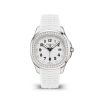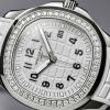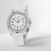 New Patek Philippe Aquanaut Luce luxury Ladies watch, with a larger diameter 38,8mm, Stainless Steel, Ref. 5267/200A-010. The first complex quartz wristwatch in the modern Aquanaut sports collection, which perfectly matches the character of this young and dynamic watch line. His Stainless Steel rounded, pillow-like octagon-shaped case and gently curved lugs, complemented by polished and satin finishes are unmistakable. On a beautiful Matte white dial with embossed “Aquanaut” harmoniously looks perfectly readable large applied polished Arabic numerals made of blackened 18k White Gold with luminescent coating in the form of hour markers. The manufacturer paid special attention to the second track on the outer rim of the dial, on which applied black lines with fairly wide luminous marks located every 5 minutes. Large polished luminous hour and minute hands in blackened 18k White Gold indicate the time. These are complemented by a slim and elegant second hand (Sweep seconds hand). The date window is traditionally at the 3 o’clock position. A polished Stainless Steel screw-down crown with a ribbed edge for a comfortable grip and the Patek Philippe logo is the finishing touch to the perfect picture. The dial is covered with a scratch-resistant sapphire crystal. The screw-down Solid case back is made of Stainless Steel. The elegant highlight of this model is the fixed sparkling Stainless Steel bezel set with 48 diamonds totaling 1,1cr with polished on the sides, provides a wide view of the dial. The finish on the side of the bezel is amazing because at first glance, it looks rounded, but upon closer inspection, you can see the crisp edges playing with the light. The model is equipped with a Patek Philippe caliber E 23‑250 S C with a Quartz movement powered by a silver oxide battery with a 3-year lifespan. This beautiful sport chic watch is presented on an Integrated matte white Composite material strap. He is highly resistant to wear, salt water and UV radiation. The strap are fastens with Patek Philippe’s patented Stainless Steel folding clasp, polished and engraved with the Calatrava cross. Opening the clasp reveals the engraved Patek Philippe logo with the word GENEVE. Water resistant up to 120m/394ft (12 ATM).